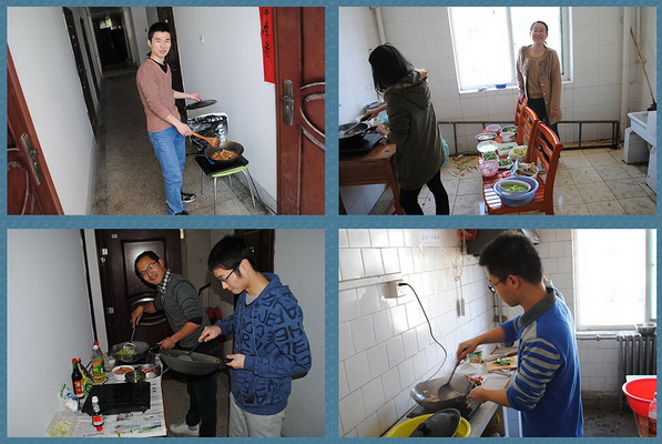 把这么多来自不同地方,饮食习惯各异的人聚集在一起做菜;他们或者是喜欢麻辣的川菜系的同学,或者是食味比较甜淡的沿海的同学,或喜好甜食或擅长海鲜,当然还有我这吃得东西南北各种口味的内地人。准备秘而不宣,烹调紧锣密鼓,到中午12点的时候各个小组的菜基本上都完成。