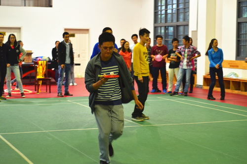 参加此次趣味运动会的有研一、研二、博一的同学,参赛队员分成六支队伍,每支队伍八名成员,在安光所研会副主席陈小威简单介绍完游戏规则和游戏项目之后,活动就开始了。首先是“两人三足跑”,随着裁判员一声哨响,比赛正式开始,只见同学们一边手挽手保持平衡,一边喊着口号加快步伐向终点奔去。经过第一轮的比赛,活动气氛逐渐热烈起来。接着是妙趣横生的“螃蟹背西瓜”比赛,每支队伍的两名队员背靠背站立,背部夹一个篮球,手里面还要拿两只气球侧着身子往前跑,形式虽然简单,但是想以最快的速度跑到终点还是很有难度的,现场欢笑声和加油声此起彼伏。比赛在“抛绣球”的活动中推向高潮了,每支队伍选出六名代表,一人拿着小筐在五米开外等着队员们往里面抛球,最有难度的是队员们要背着抛,更考验了队员之间的默契,给活动增加了难度,同时也带来了不少欢笑。之后进行的“托球跑”和“两人前后跑”比赛,再次把现场的气氛调动起来,啦啦队员们则是加油鼓劲,鼓掌欢呼,每个人都尽情享受其中。