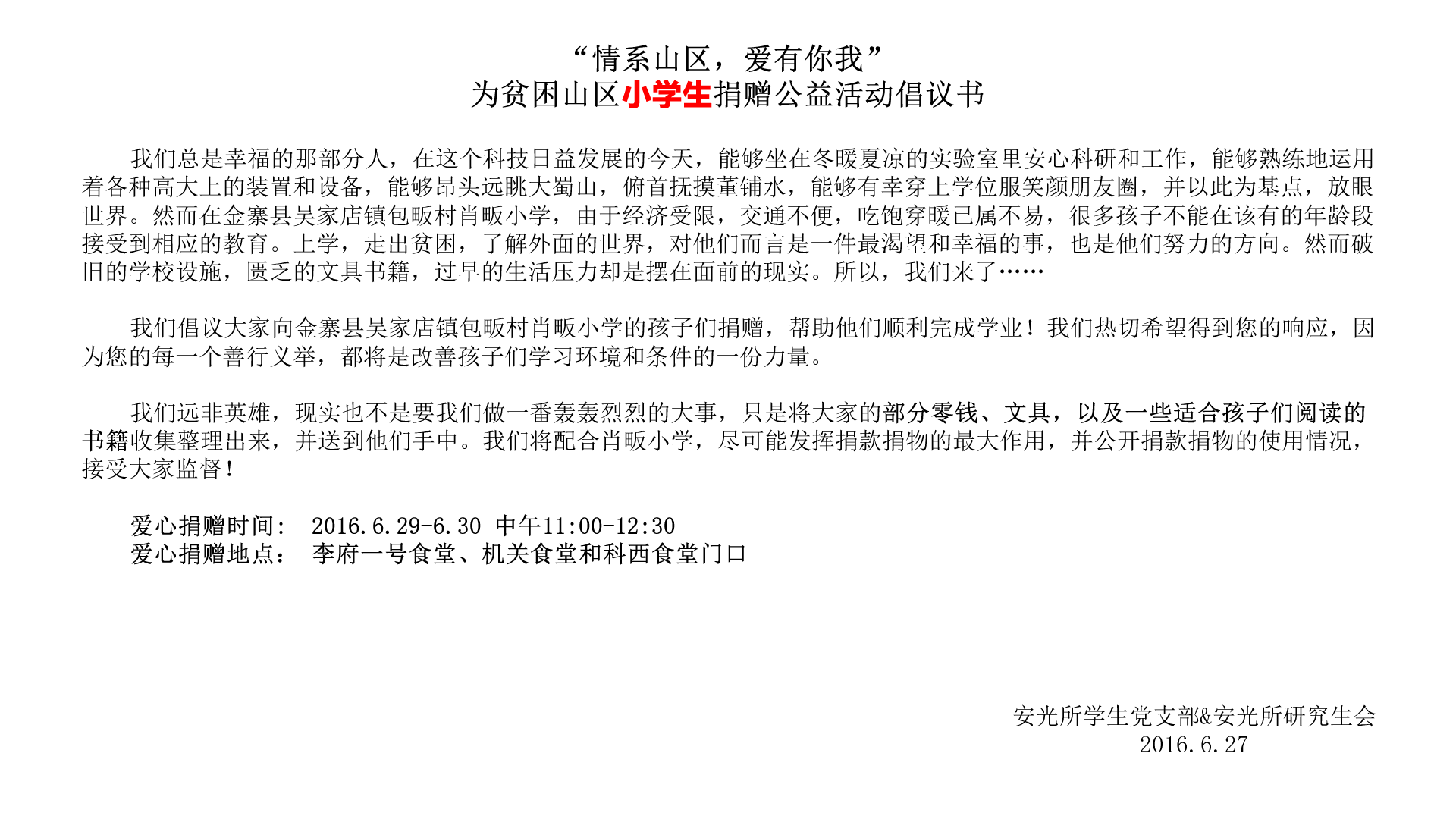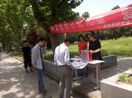 为庆祝建党95周年,安光所学生党支部和研究生会于七一来临之际在科学岛上联合发起为贫困山区小学生爱心募捐的公益活动,各研究所、各中心的学生和职工们积极参与其中,纷纷慷慨解囊,踊跃捐款捐物。