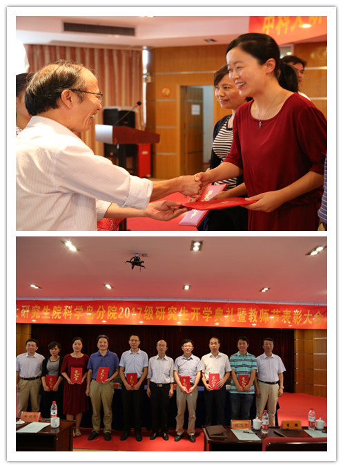 吴四发副院长宣读了《关于表彰2017年度合肥物质科学研究院优秀研究生导师的决定》,田明亮、黄行九、孟国文、张欣、方晓东、张忠平、张云霞、黄青、吴正岩、饶瑞中、孙敦陆、谢品华、何亚伯13位导师获此殊荣,王英俭书记为获得表彰的部分导师代表颁奖。