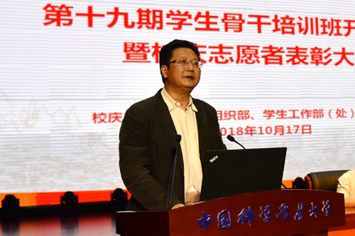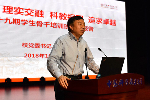 最后,校党委书记舒歌群为学生骨干培训班学员作题为“红专并进、理实交融,科教报国、追求卓越”的主题报告。书记首先对科大的校史校情、人才培养、学科建设、园区建设做了全面阐述,提到科学岛分院的托卡马克装置以及稳态强磁场装置为学校的高水平学术研究奠定了扎实的基础;其次他还从爱国、励志、求真、力行四个方面对新时代的新青年提出要求,希望同学们时时刻刻按习总书记提出的要求严格要求自己,努力成长为德智体美劳全面发展的社会主义建设者和接班人。