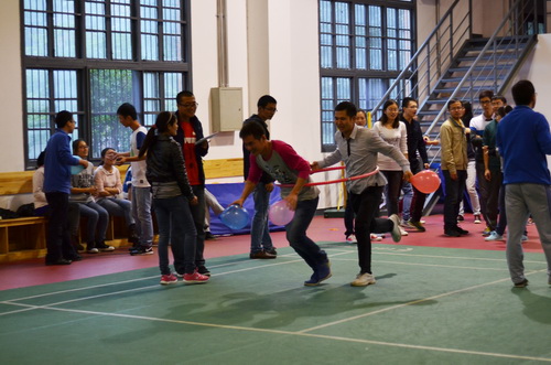 参加此次趣味运动会的有研一、研二、博一的同学,参赛队员分成六支队伍,每支队伍八名成员,在安光所研会副主席陈小威简单介绍完游戏规则和游戏项目之后,活动就开始了。首先是“两人三足跑”,随着裁判员一声哨响,比赛正式开始,只见同学们一边手挽手保持平衡,一边喊着口号加快步伐向终点奔去。经过第一轮的比赛,活动气氛逐渐热烈起来。接着是妙趣横生的“螃蟹背西瓜”比赛,每支队伍的两名队员背靠背站立,背部夹一个篮球,手里面还要拿两只气球侧着身子往前跑,形式虽然简单,但是想以最快的速度跑到终点还是很有难度的,现场欢笑声和加油声此起彼伏。比赛在“抛绣球”的活动中推向高潮了,每支队伍选出六名代表,一人拿着小筐在五米开外等着队员们往里面抛球,最有难度的是队员们要背着抛,更考验了队员之间的默契,给活动增加了难度,同时也带来了不少欢笑。之后进行的“托球跑”和“两人前后跑”比赛,再次把现场的气氛调动起来,啦啦队员们则是加油鼓劲,鼓掌欢呼,每个人都尽情享受其中。