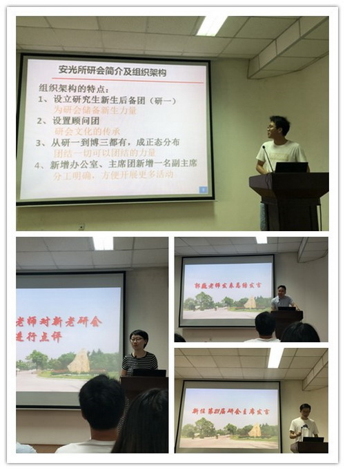 第20届所研会主席储玉飞对本届研究生会的组织框架和工作进行了回顾与总结。随后,5名候选人依次上台发表所研会主席团竞选演讲,经无记名投票选举确认了17级硕士孙宇松、18级博士方志远、17级硕士陈迎迎、17级硕士吴涛为第21届研究生会主席团成员。新一届研会成员分别进行了自我介绍,新一届研会主席孙宇松发表就职演讲。兄弟院所研会代表阮月、巫阳和李健陆续发言,祝贺新一届安光所研究生会成立,希望今后能进一步加强各单位研究生会工作的交流合作。