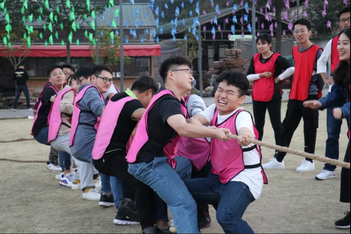 同学们乘车来到蓝山湾生态园,在教练幽默风趣的开场中,同学们渐渐放下了拘谨,活动氛围也开始升温。同学们随机分成四个小组,并分别起了队名和设计了队旗口号,挑选了队歌。团建活动中,同学们以组为单位,进行了毛毛虫、扭转乾坤、大脚鞋接力、横向两人三足、袋鼠跳等竞技小活动。同学们相互配合,通力协作,候场的同学也在一旁加油助威或是帮忙递道具。在集体拔河比赛环节,同学们也充分感受到了团结一致的集体力量。