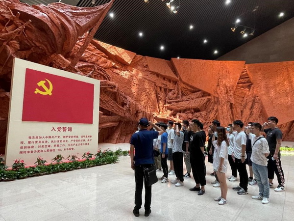 进入纪念馆内,研究生智能所第二党支部纪律委员张辉同志带领同学们高举右手,在鲜红的党旗下重温入党誓词,表达了同学们“不忘初心、牢记使命、继续前行、献身祖国”的坚定信念。