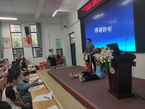 接下来,志愿者刘勇结合政府最新体育政策就学校关心的中考体育考试项目进行了细致入微的讲解,并现场演示动作要领,在讲解理论的同时还邀请了同学上台进行实际操练,该环节得到了在场学生的积极参与,现场气氛非常活跃。