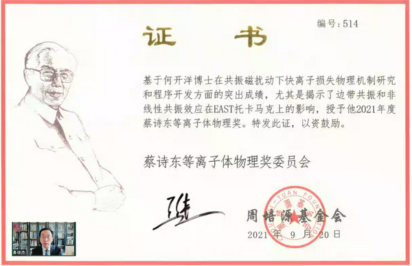 国际知名激光等离子体物理学家张杰院士为获奖人何开洋博士在线颁奖,随后何开洋受邀作了题为“EAST共振磁扰动下高能离子损失及物理机制研究”的获奖报告。本届蔡诗东等离子体物理奖评选在提名委员会经过多轮会议讨论后,基于“何开洋博士在共振磁扰动下快离子损失物理机制研究和程序开发方面的突出成绩,尤其是揭示了边带共振和非线性共振效应在EAST托卡马克上的影响”,决定授予何开洋博士2021年度蔡诗东等离子体物理奖。何开洋博士也是此次2020年及2021年两届蔡诗东等离子体物理奖中唯一在磁约束聚变领域的获奖人员。