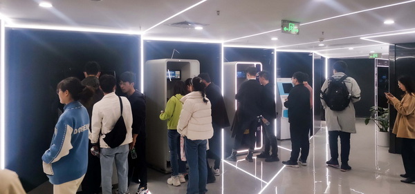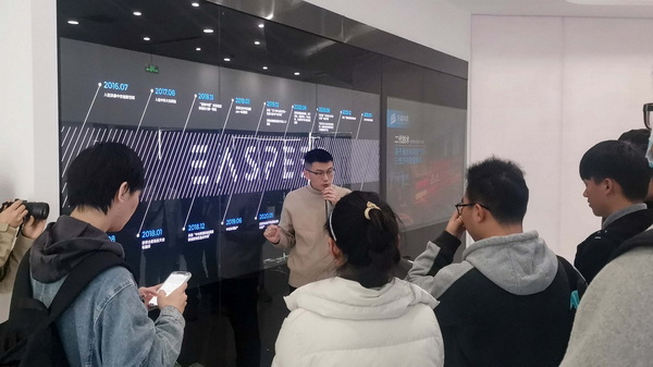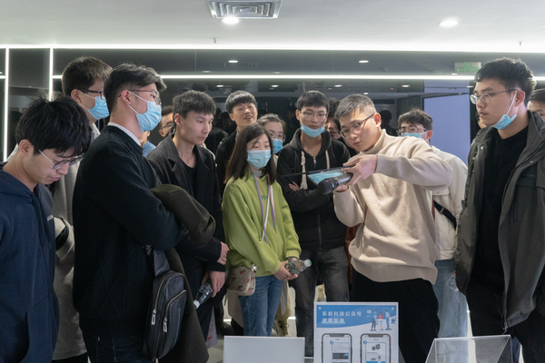 活动中,同学们首先参观了东超科技展厅。在展厅里,司马超从发展历史、成果奖项、应用场景、技术原理、知识产权、领导关怀等多个角度详细介绍了东超科技公司,并带领同学们实际体验了“无接触自助挂号机”、“无接触拨号键盘”、“无接触电梯按钮”、“空中成像讲台”等多项产品,让同学们对可交互空中成像技术有了更深的了解。