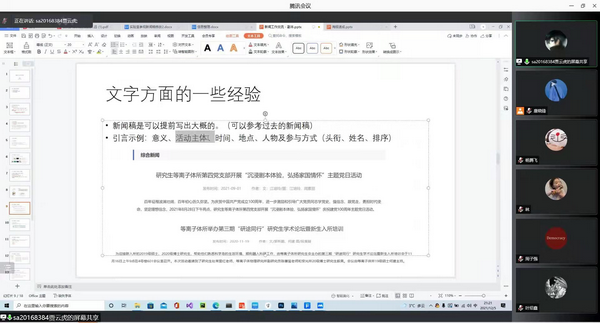 12月5日,第三次宣传技能培训在线上顺利进行,内容主要围绕“海报设计”和“新闻稿撰写”两部分展开,主讲人为院研会宣传部成员贾云虎。贾云虎主要讲述了做海报的流程顺序、海报的排版、制作自定义素材、海波调色以及新闻稿撰写等内容,并进行了现场演示。