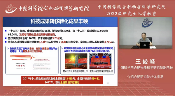 王俊峰作合肥研究院总体情况介绍,并宣读《合肥研究院2022年度优秀导师表彰决定》、《中国科大2022年度科教融合优秀导师表彰决定》、《第二届研究生创新创业大赛“科学岛创星奖”表彰决定》以及《中国科大2022年度科教融合优秀研究生表彰决定》,希望获奖老师和学生继续发扬追求卓越的精神,不忘初心,再接再厉,再创佳绩。