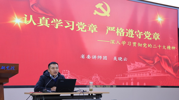 第二场报告题目是《认真学习党章 严格遵守党章》,报告中,吴晓云教授全面介绍了党章的地位作用和党章的发展历程、党的二十大对党章的修改内容,对党员干部应该如何学习党章、尊崇党章提出了意见建议。报告会后,与会同志深深体会到:党章是史,记载我们党经验教训;党章是旗,指引我们党前进方向;党章是法,规范我们党管党治国。我们要学习党章,尊崇党章、维护党章。