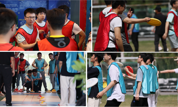 飞盘分为飞盘射门、飞盘九宫格、飞盘掷框等三个小项。这些项目考验的不仅是队员们攻、防的技术,还考验了整支队伍的意志力与坦诚默契的团队合作。在紧张激烈的比赛中,团队成员间的距离被迅速拉近,同学们逐渐进入了状态。