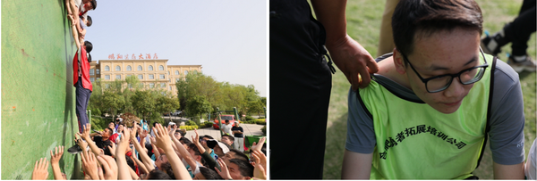 毕业墙是这次团建活动的最后一个项目,它要求所有同学在不借助任何工具的情况下徒手翻越一堵4.2米的高墙。困难总是令人望而生畏的,但在经过一天的团队合作与教官的详细讲解后,全体同学勇敢地开始了挑战。