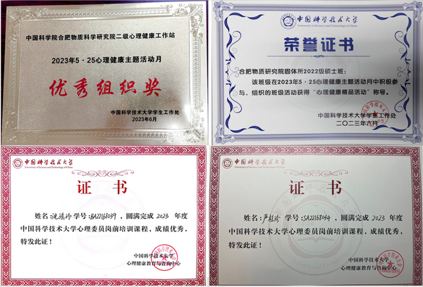 根据网络平台学习、线下培训讲座、素质拓展训练、班级心理活动组织等条件,授予合肥物质院研究生沈瑶玲、严桂珍为2022级心理委员“优秀学员”称号。
