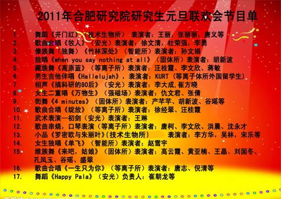 辞旧迎新,在2011元旦佳节到来之际,合肥研究院研究生部、研究生会将于12月29日下午举办合肥研究院研究生2011年元旦联欢会。