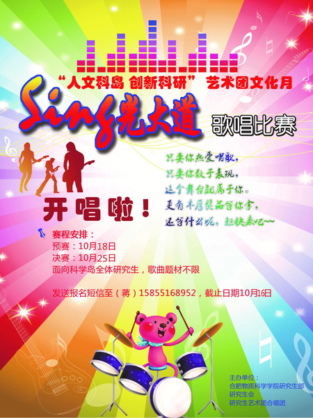 为丰富科学岛研究生文化生活,提高研究生的综合素质,研究生艺术团合唱队将举办“Sing光大道”歌唱比赛,向多才多艺的科学岛研究生们提供一个展示自我的平台。用音乐展示自我,用旋律谱出辉煌,比赛即将开唱,只要你热爱唱歌,只要你敢于表现,这个舞台就属于你。