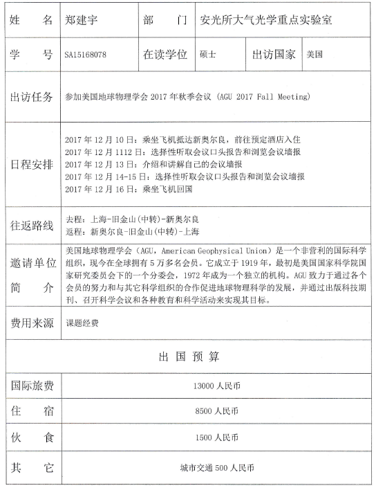 中国科学院合肥物质科学研究院研究生因公临时出国(境)事前公示表