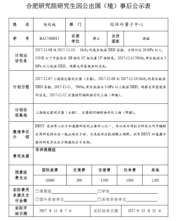 研究生陈刘城因公出国(境)事后公示表