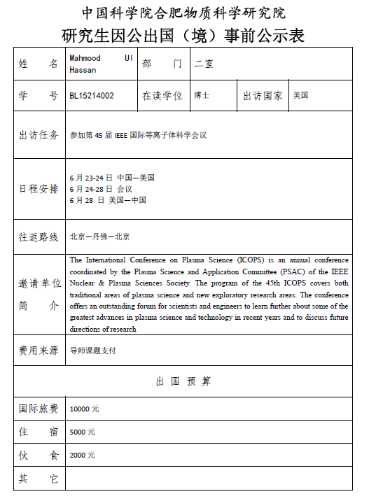 研究生因公出国(境)事前公示表(Mahmood Ul Hassan)