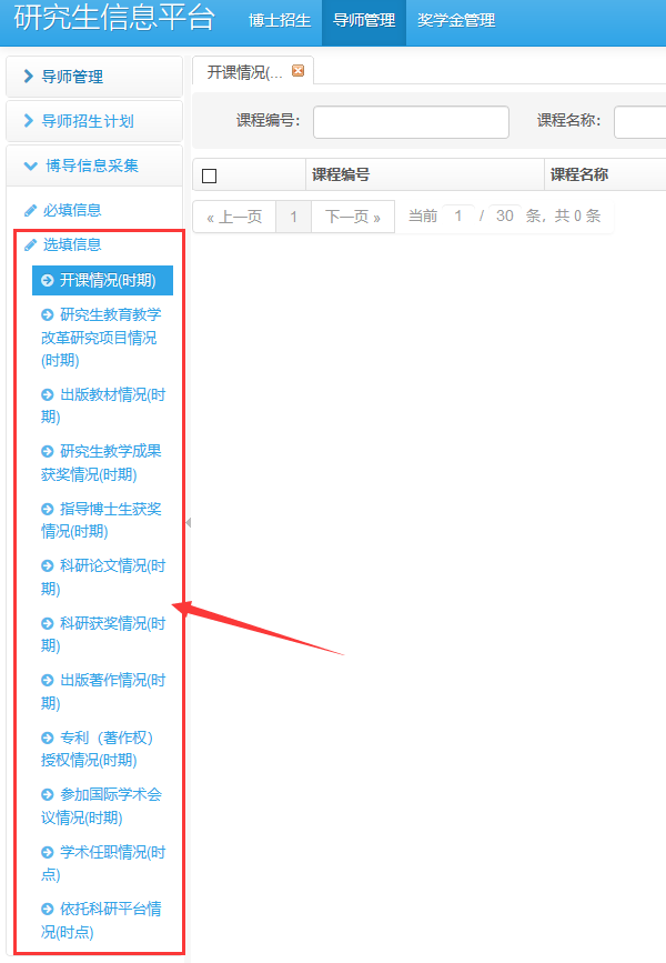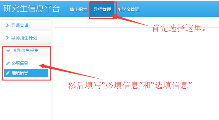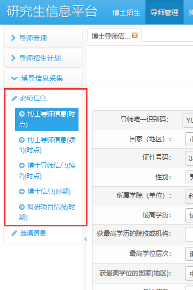 1、登录系统后选择“导师管理”、“博导信息采集”