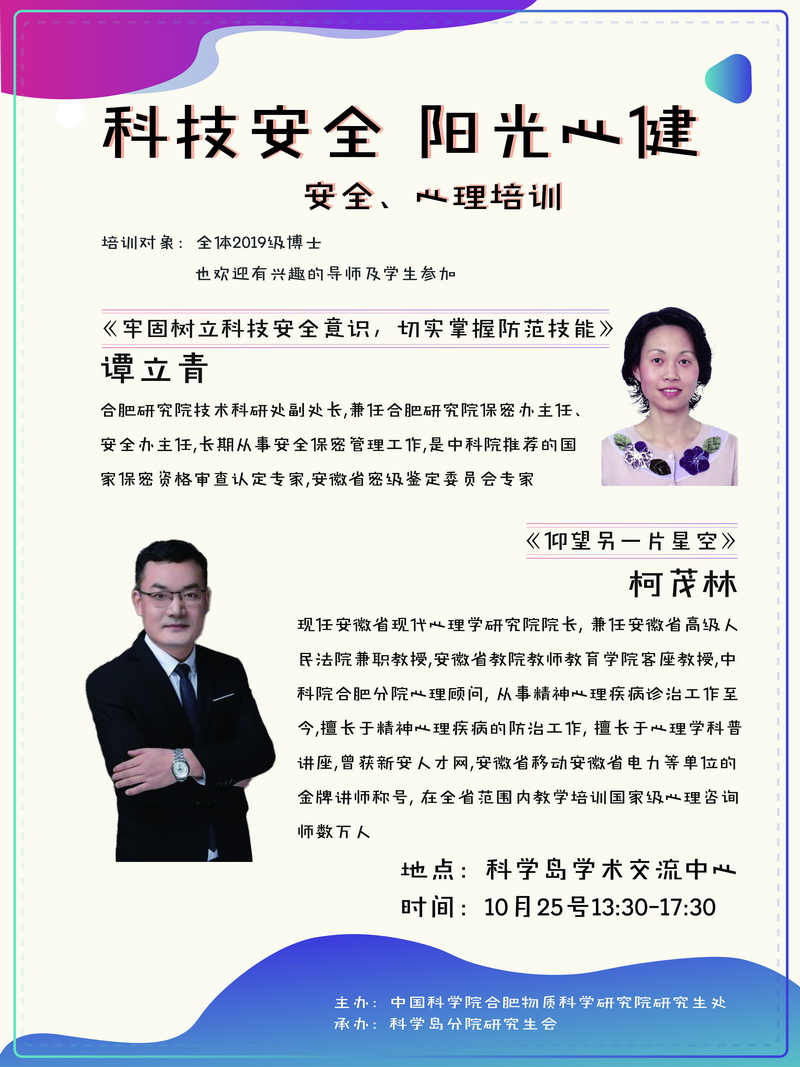 定于2019年10月25日13:30-17:30在科学岛学术交流中心4楼报告厅举办2019级博士研究生安全教育培训,请全体2019级博士研究生准时参加本次培训。
