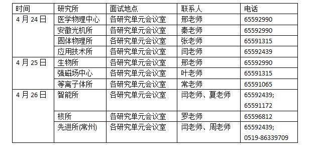 中国科学技术大学研究生院科学岛分院2019年博士面试时间为2019年4月24-26日,请笔试达线的同学按照下面的日程安排,提前一天到科学岛三河丽景假日酒店报到,按时参加面试。面试要求参考科学岛分院2019年博士研究生招生公告及实施细则(http://www.hf.cas.cn/sbpy/yjsb/zs2019/bszs/201901/t20190109_5226315.html)。
