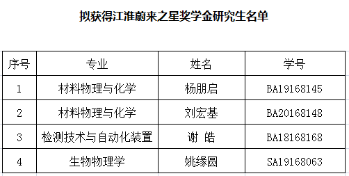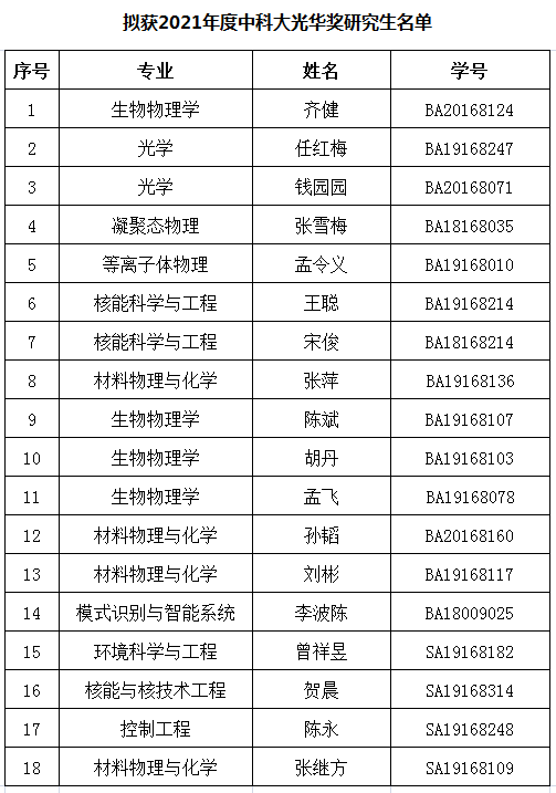 根据中国科学技术大学《关于2021年度专项奖学金评定工作的通知》要求,经研究生个人申报,合肥物质科学研究院奖学金评审委员会终评,通过18名研究生拟入选2021年度中国科学技术大学光华奖学金,通过4名研究生获得江淮蔚来之星奖学金。现将拟入选的研究生名单公示如下,公示期限:2021.10.18-2021.10.22。联系电话:0551-65591315/65591600,邮箱:hyye@hfcas.ac.cn/ 。sunly@hfcas.ac.cn