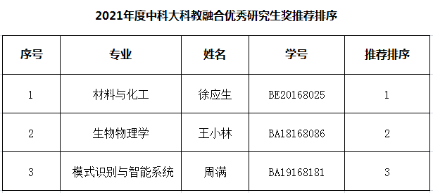 根据中国科学技术大学《关于评选2021年中国科学技术大学科教融合优秀研究生奖和优秀导师奖的通知》要求,经研究生个人申请,合肥物质科学研究院奖学金评审委员会评选,初选通过以下3名研究生推荐至中科大进行校级差额终选。 现将名单进行公示,公示期限:2021.10.18-2021.10.24。联系电话:0551-65591315/65591600,邮箱:hyye@hfcas.ac.cn/ sunly@hfcas.ac.cn