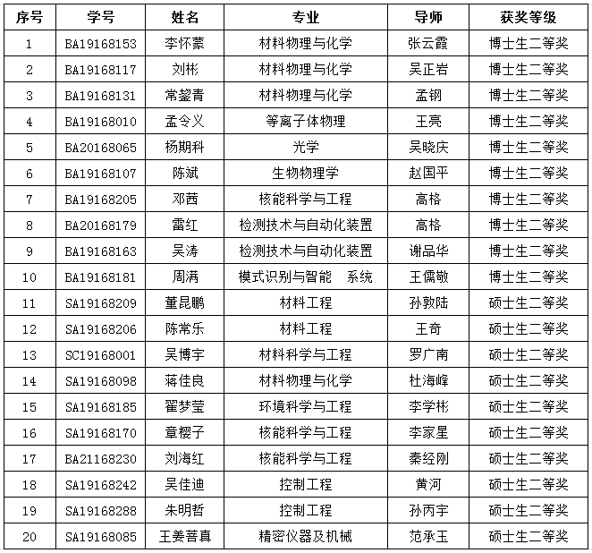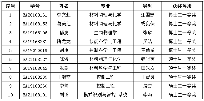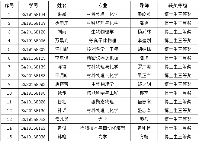 根据合肥研究院与陶悦群先生签署的《关于设立中国科学院合肥物质科学研究院“悦群品学兼优奖学金”的合作协议》以及《合肥研究院关于开展2021年度“悦群品学兼优奖学金”评选工作的通知》要求,经研究生本人提出申请,各科研单元教育主管组织资格审核,各科研单元初选,合肥研究院悦群奖学金评审委员会终评,确定以下同学获得2021年度中科院合肥物质科学研究院“悦群品学兼优奖学金”。现将获奖信息公示如下,公示期限:2021.12.14-2021.12.20。联系电话:0551-65591315/65591600,邮箱:hyye@hfcas.ac.cn/ sunly@hfcas.ac.cn