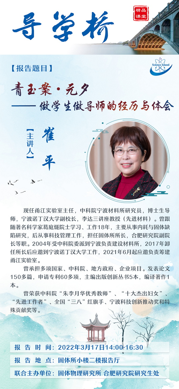 第三期课程特邀甬江实验室主任、中科院宁波材料所崔平研究员开讲,安排详见文末海报,请全体导师积极参与,请可以参会的导师邮件至zhulj@hfcas.ac.cn或致电65596812告知,以便我们做好会务协调工作。