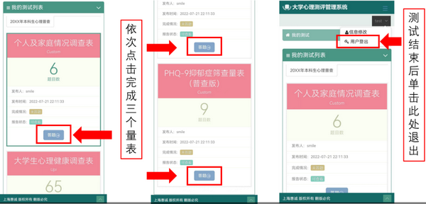4、依次对 “我的测试列表”中“个人及家庭信息调查表”、“大学生心理健康调查表”和“PHQ-9抑郁症筛查量表”三个量表进行测试。点击“答题”按钮,依次测试完成测试量表后提交,所有题目均为必填项,量表提交后不可修改。