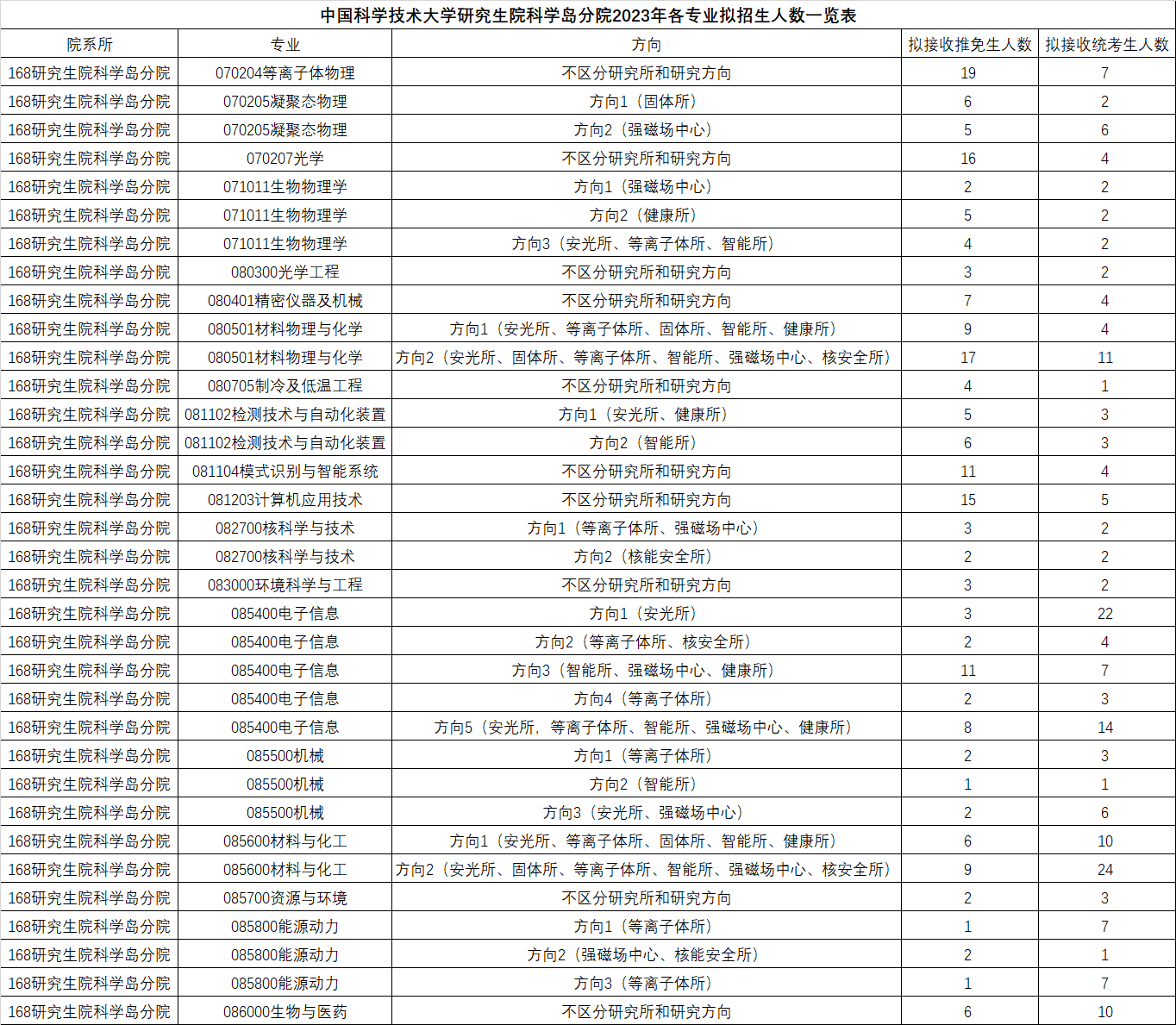 中国科学技术大学研究生院科学岛分院2023年各专业拟招生人数一览表