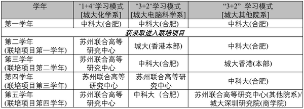联培项目的修读年限一般为四年。原则上学生第一学年在中科大修读并完成公共必修课和学科基础课程,第二至第五学年按以下学习模式分别在中科大、城大及城大认可的内地校区(本联培项目包括中科大-城大联合高等研究中心(苏州)和城大深圳研究院),修读部分专业课及完成学位论文。