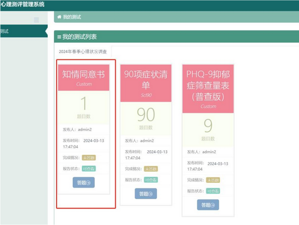 3.进入测评界面,先点击“知情同意书”的“答题”按钮,阅读并确认。