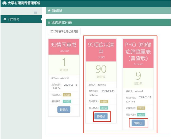 4.依次对“我的测试列表”中“90项症状清单”和“PHQ-9抑郁症筛查量表(普查版)”两个量表进行测试。点击“答题”按钮,依次测试完成测试量表后提交,所有题目均为必填项。注意:量表提交后不可修改。