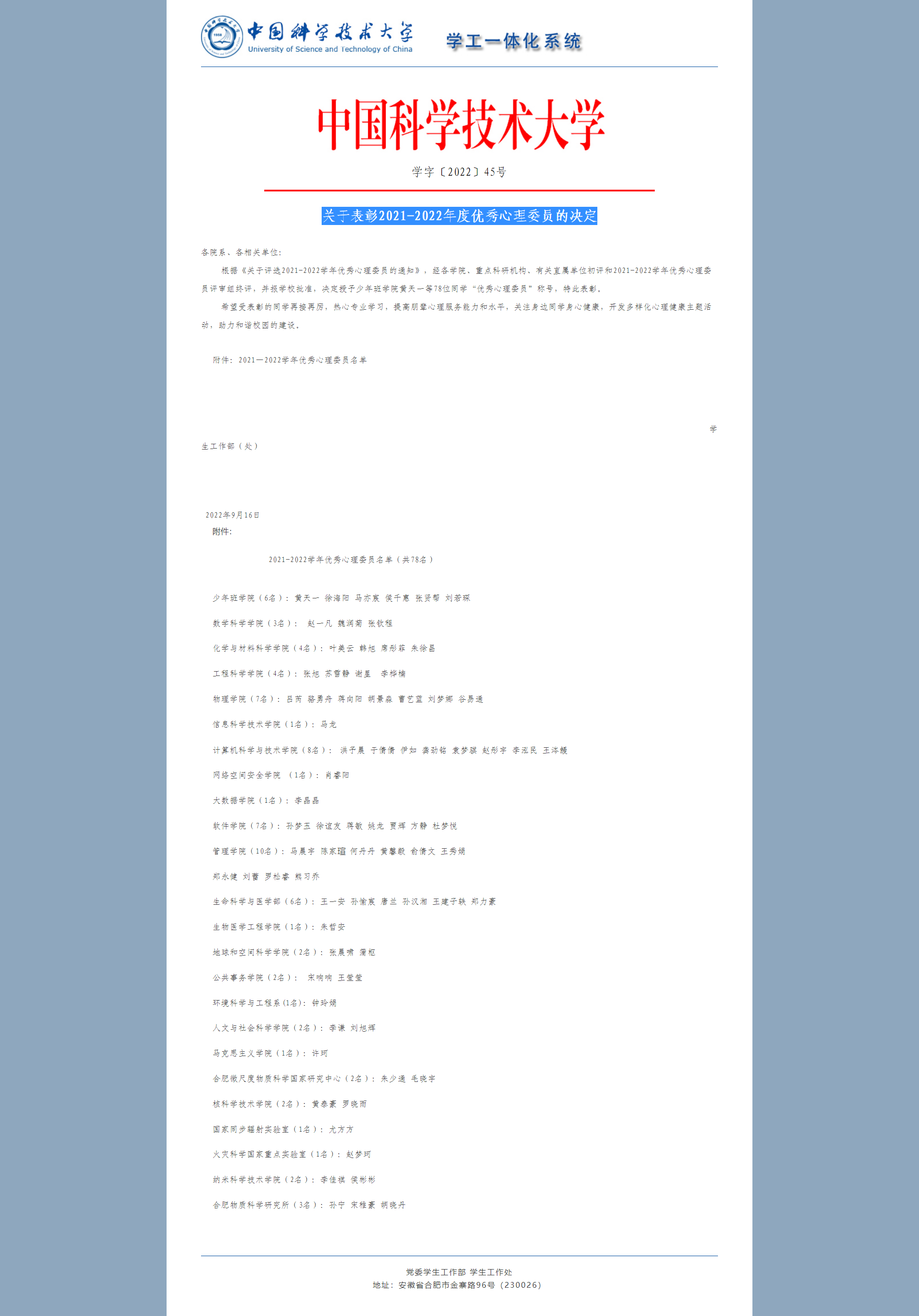 中国科学技术大学2021-2022年度优秀心理委员表彰名单