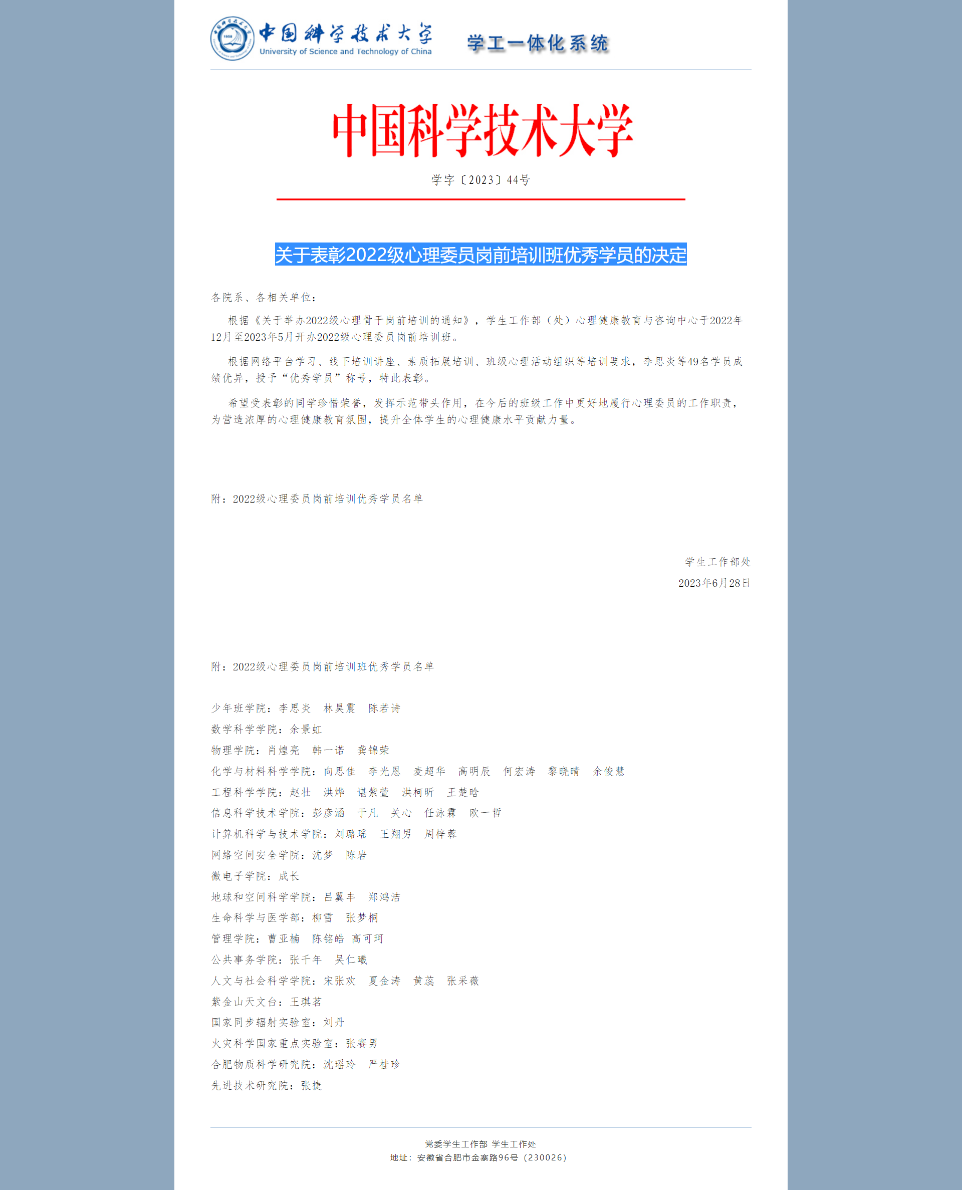 中国科学技术大学2022级心理委员岗前培训班优秀学员名单