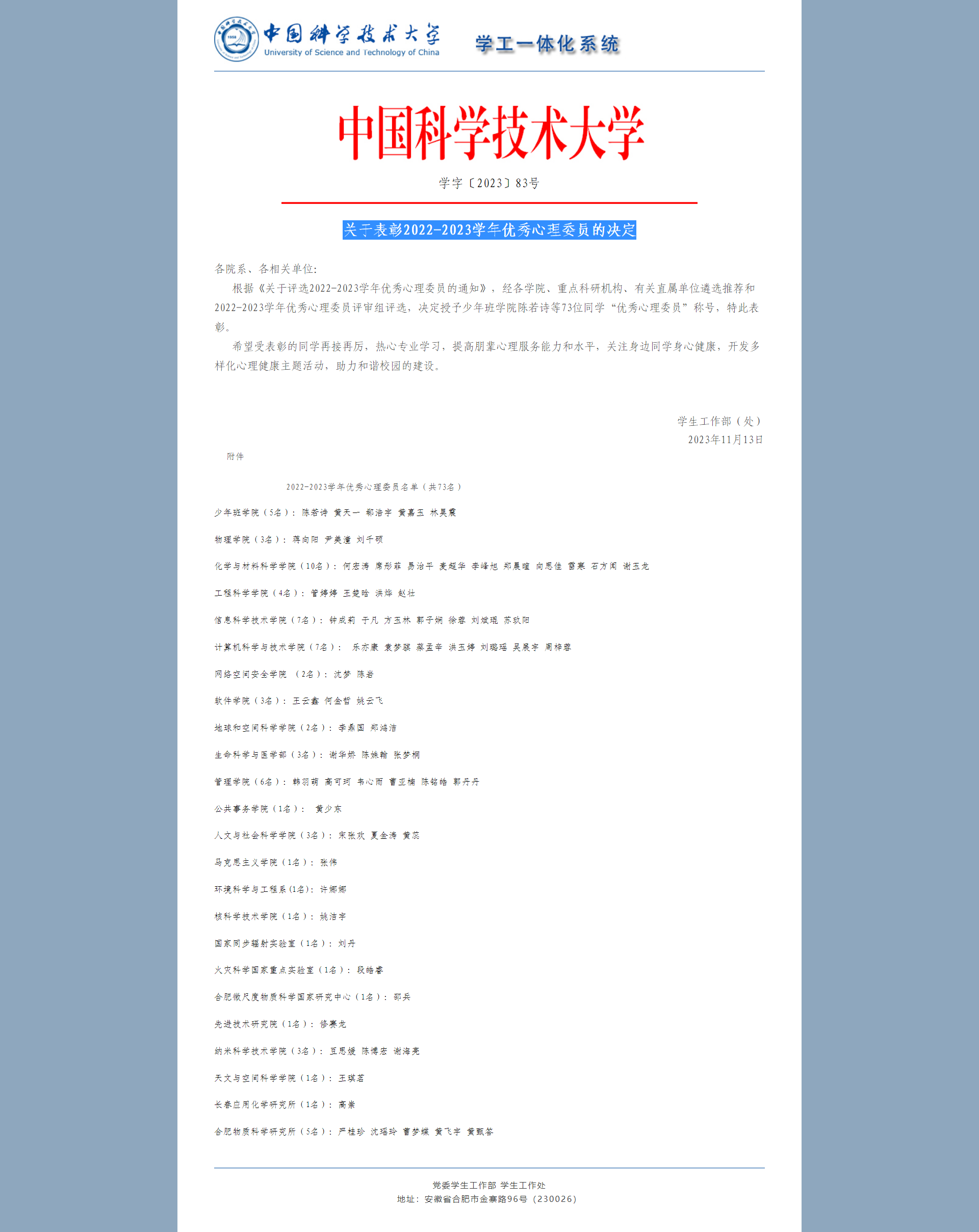 中国科学技术大学2022-2023学年优秀心理委员表彰名单