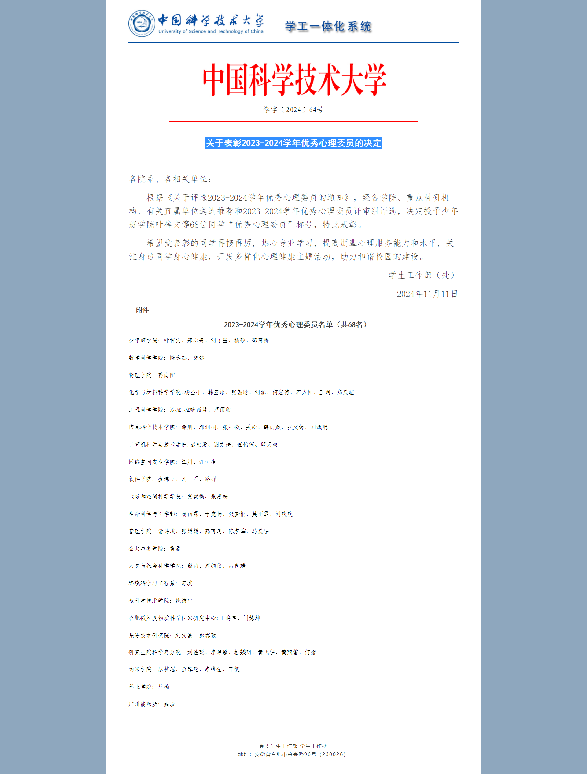 中国科学技术大学2023-2024学年优秀心理委员表彰名单