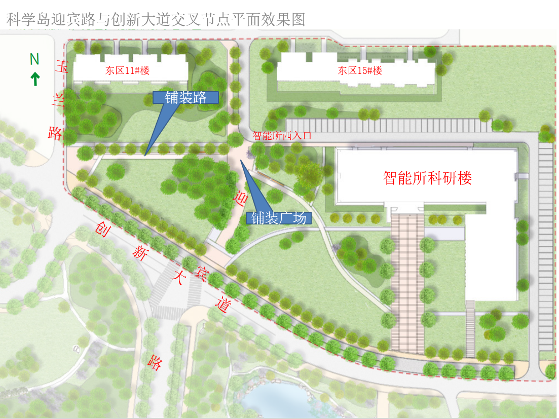 1、本项目实施后迎宾路智能所科研楼西入口到创新大道交叉口段改成石材铺装广场,禁止机动车通行,仅供行人和非机动车辆通行,机动车可从玉兰路、丹桂路或湖滨北路绕行。迎宾路智能所科研楼西入口到湖滨北路段维持现状不变。