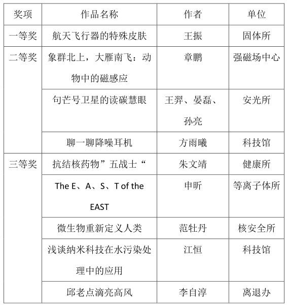 为促进科学岛高端科研资源科普化,提升科技工作者的写作表达能力,合肥现代科技馆近期举办了第三届科学岛原创科普征文活动。经评定,遴选出一等奖1名、二等奖3名、三等奖5名。对于获奖人员将颁发证书并给予一定的物质奖励。