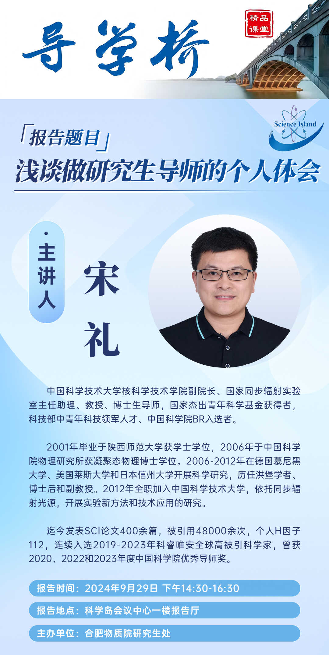 第七期课程特邀中国科学技术大学核科学技术学院宋礼教授开讲,安排详见文末海报,请全体导师积极参与,如不能出席,请提前发送请假信息至邮箱zhulj@hfcas.ac.cn或致电65592990告知,以便我们做好会务协调工作。