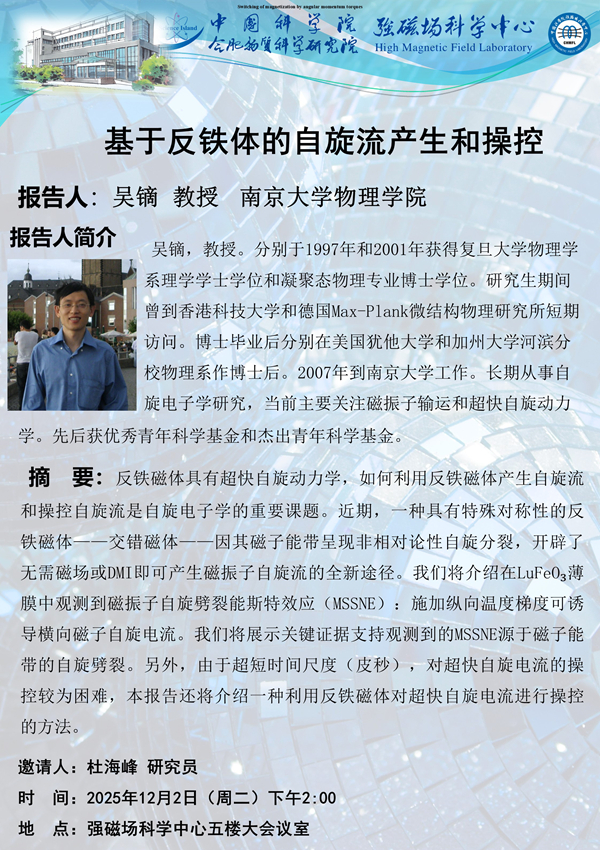 【12.02】学术报告:基于反铁体的自旋流产生和操控