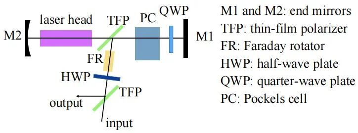 - 再生放大器多以薄片增益介质为核心构建,借助光调制器与薄膜偏振片实现激光束的腔注入与输出控制,该构型兼具优异的热管理性能与光束质量控制,其典型结构如图1所示。2019 年,德国通快科学激光有限公司(Trumpf)基于双薄片激光模块与环形再生腔结构,在20 kHz重频工况下,将薄片再生放大器的最大输出功率提升至1.9 kW,光-光转换效率高达38%,该指标为目前已报道的皮秒级薄片再生放大器的最高光光效率。