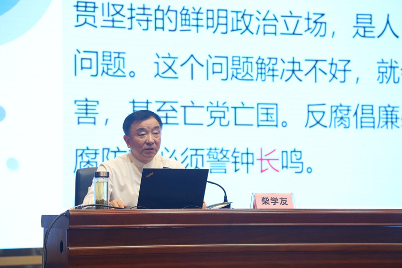 柴学友教授以其丰富的法律实践经验和深厚的学术造诣,结合目前开展的党纪学习教育,从法治反腐的新时代背景、当前职务犯罪的形势与特点、职务犯罪的心理剖析、危害及预防等多个方面进行了深入浅出的讲解,运用不同省内外大量最新数据和生动案例,从“高官巨贪”到“小官大贪”,从机关单位到国有企业,以案说纪、以案说法,深入分析讲解了职务犯罪的特点和社会危害性,为与会人员上了一堂生动的廉政教育课,让与会人员对职务犯罪有了更加清晰的认识,并深刻感受到了廉洁自律的重要性。