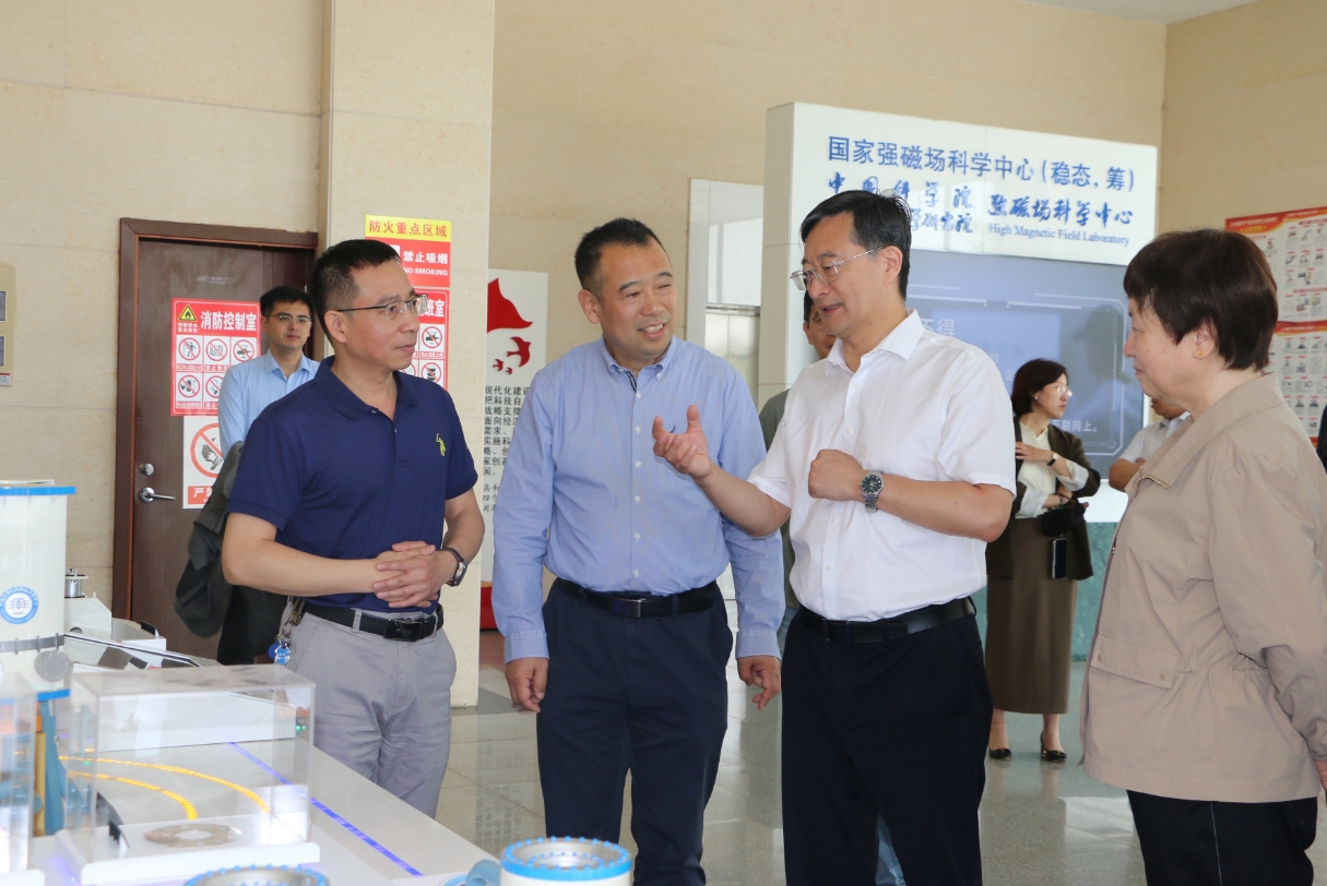 随后,王云鹏一行参观了稳态强磁场实验装置,在装置科研实验大厅、装置大厅,强磁场中心副主任皮雳详细介绍了稳态强磁场实验装置建设背景及内容、强磁场技术发展、强磁场下的科学研究成果及人才队伍建设等情况。