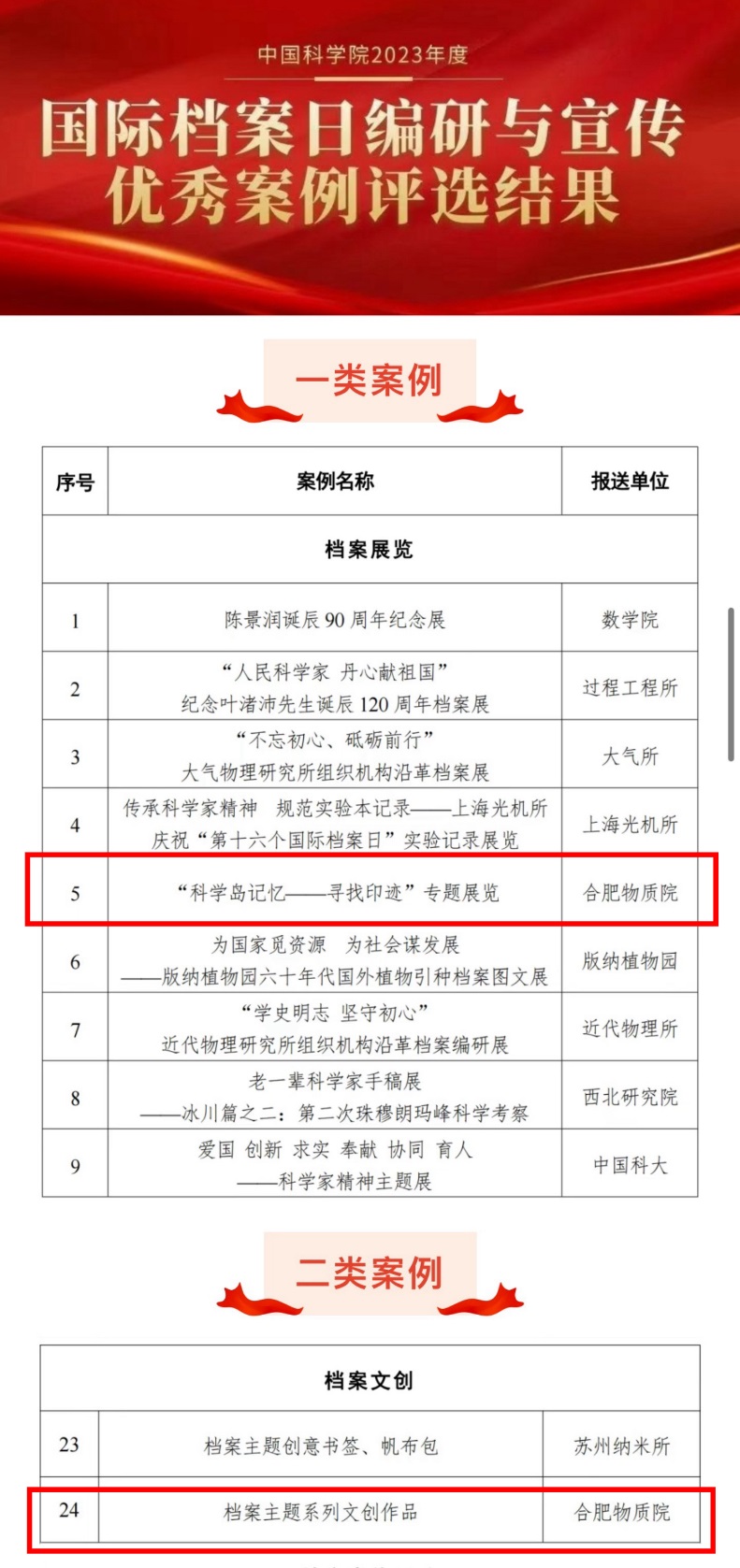 近日,中国科学院档案馆公布了2023年度国际档案日编研与宣传优秀案例评选结果,合肥物质院从208个参评案例中脱颖而出,荣获档案展览一类案例(9个)和档案文创二类案例(2个)双奖。