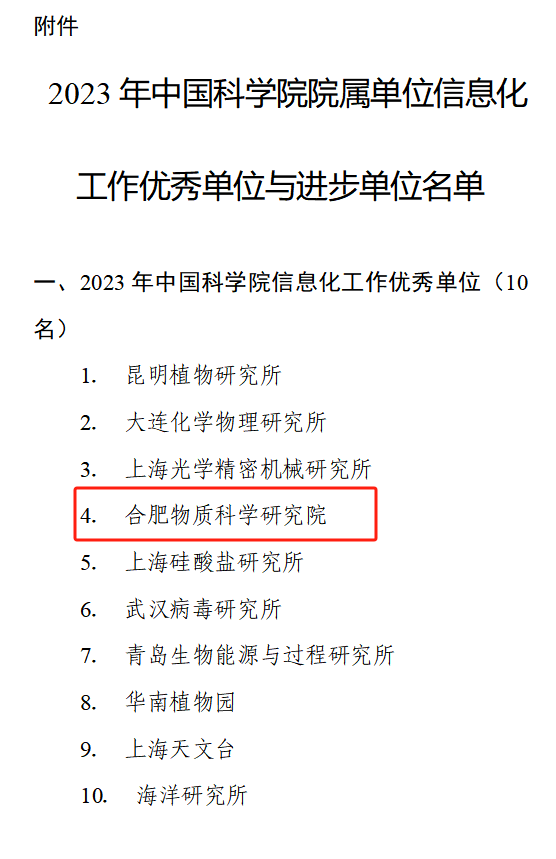 近日,中国科学院科技基础能力局下发《关于公布“中国科学院2023年信息化工作优秀单位”和“中国科学院2023年信息化工作进步单位”名单的通知》,合肥物质院在118家参评单位中,综合排名第四,连续第4年入选“中国科学院2023年信息化工作优秀单位”。