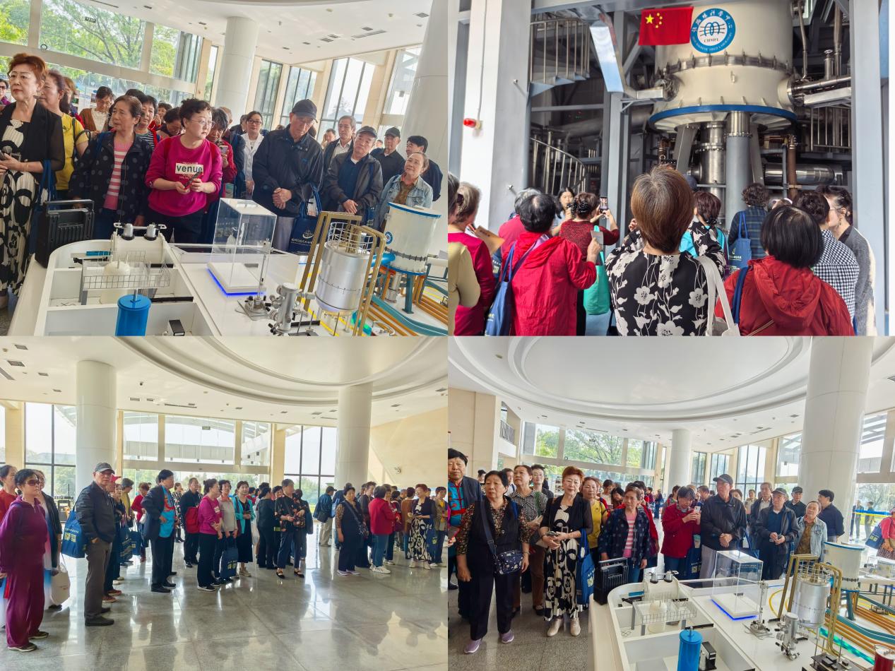 庆生活动后,老同志们集体参观了强磁场科学中心,近距离了解了成功创造最高世界稳态磁场纪录的水冷磁体和混合磁体装置研发情况。