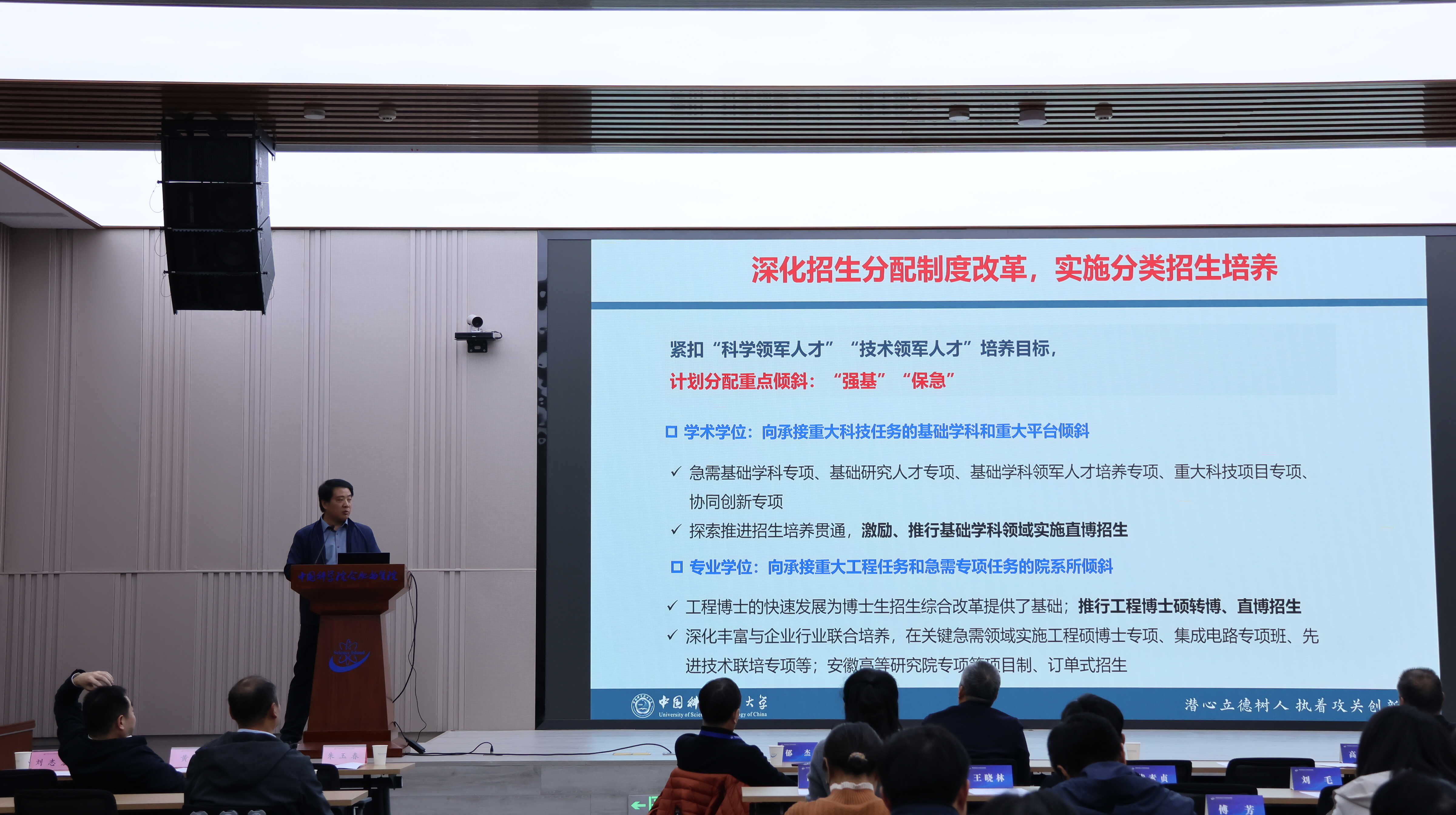 中国科学技术大学研究生院招生办公室主任朱玉春作“新形势下研究生招生工作”主题报告,介绍中国科大的办学特色、研究生招生总体情况、工程博士招生以及各类专项计划等。